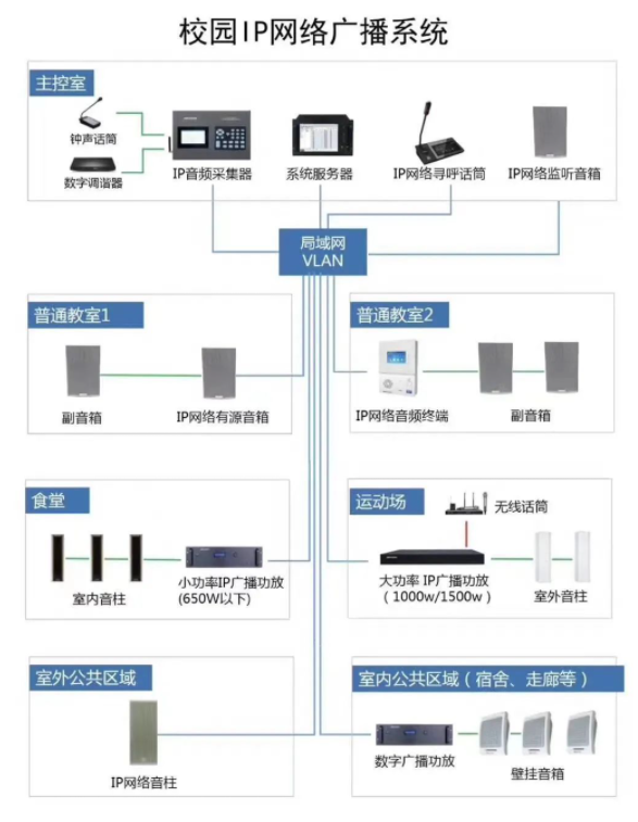 廣播系統(tǒng)設(shè)計(jì)覆蓋學(xué)校的教學(xué)樓、辦公樓、食堂、宿舍、籃球場、校園主干道等區(qū)域;廣播系統(tǒng)按樓層,結(jié)合不同的功能區(qū)域?qū)矎V播系統(tǒng)的使用區(qū)別,進(jìn)行劃分校園廣播分區(qū),本次廣播系統(tǒng)設(shè)計(jì)共5個(gè)廣播分區(qū)和教室獨(dú)立控制,具體點(diǎn)位詳見點(diǎn)位表。
